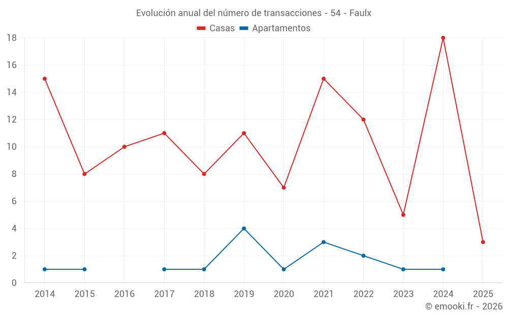 El precio mediano en las 21 transacciones de casas de los últimos 24 meses en la comuna de Faulx fue de 1 933 € por metro cuadrado para un valor patrimonial medio de 212 000 €. Durante este período el 60% de las transacciones estuvieron entre 1 257 y 2 546 € por metro cuadrado (del 2º al 8º decil).