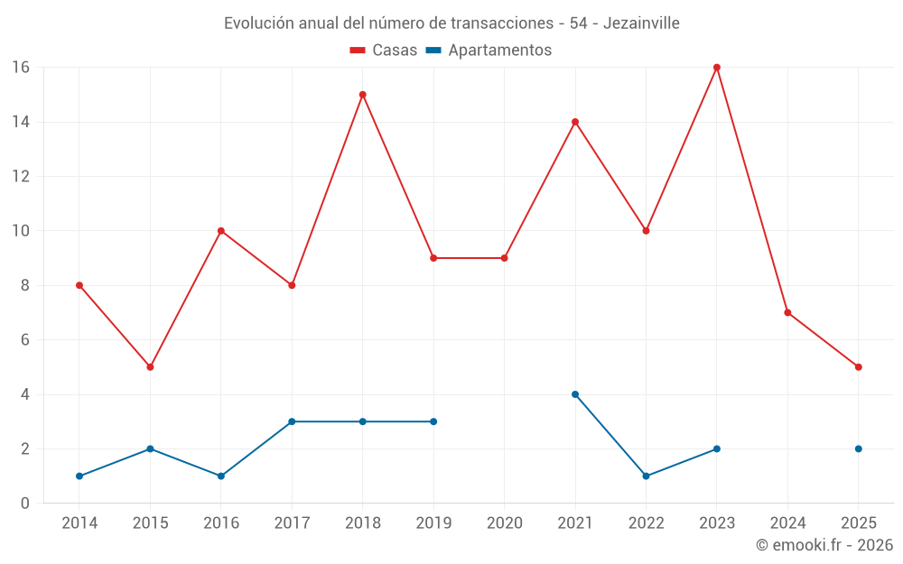 El precio mediano en las 22 transacciones de casas de los últimos 24 meses en la comuna de Jezainville fue de 1 896 € por metro cuadrado para un valor patrimonial medio de 173 000 €. Durante este período el 60% de las transacciones estuvieron entre 1 152 y 2 557 € por metro cuadrado (del 2º al 8º decil).