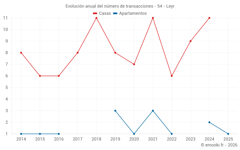 El precio mediano en las 16 transacciones de casas de los últimos 24 meses en la comuna de Leyr fue de 1 163 € por metro cuadrado para un valor patrimonial medio de 152 300 €. Durante este período el 60% de las transacciones estuvieron entre 783 y 2 078 € por metro cuadrado (del 2º al 8º decil).