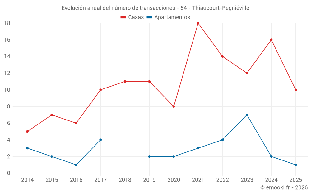 El precio mediano en las 19 transacciones de casas de los últimos 12 meses en la comuna de Thiaucourt-Regniéville fue de 1 441 € por metro cuadrado para un valor patrimonial medio de 148 800 €. Durante este período el 60% de las transacciones estuvieron entre 915 y 2 108 € por metro cuadrado (del 2º al 8º decil).