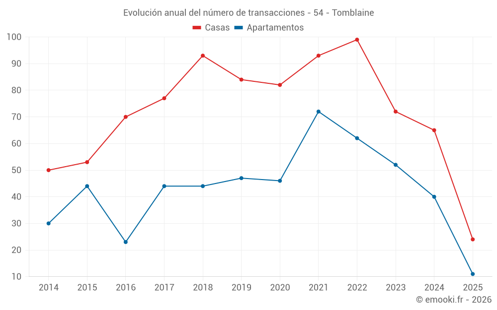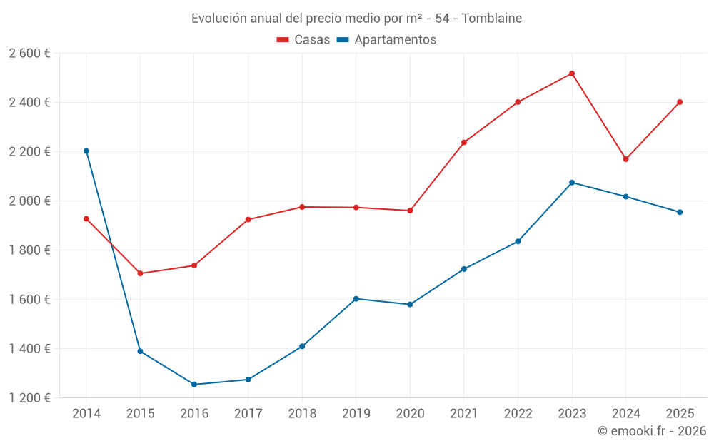 El precio mediano en las 24 transacciones de casas de los últimos 6 meses en la comuna de Tomblaine fue de 2 402 € por metro cuadrado para un valor patrimonial medio de 214 500 €. Durante este período el 60% de las transacciones estuvieron entre 1 893 y 2 589 € por metro cuadrado (del 2º al 8º decil).