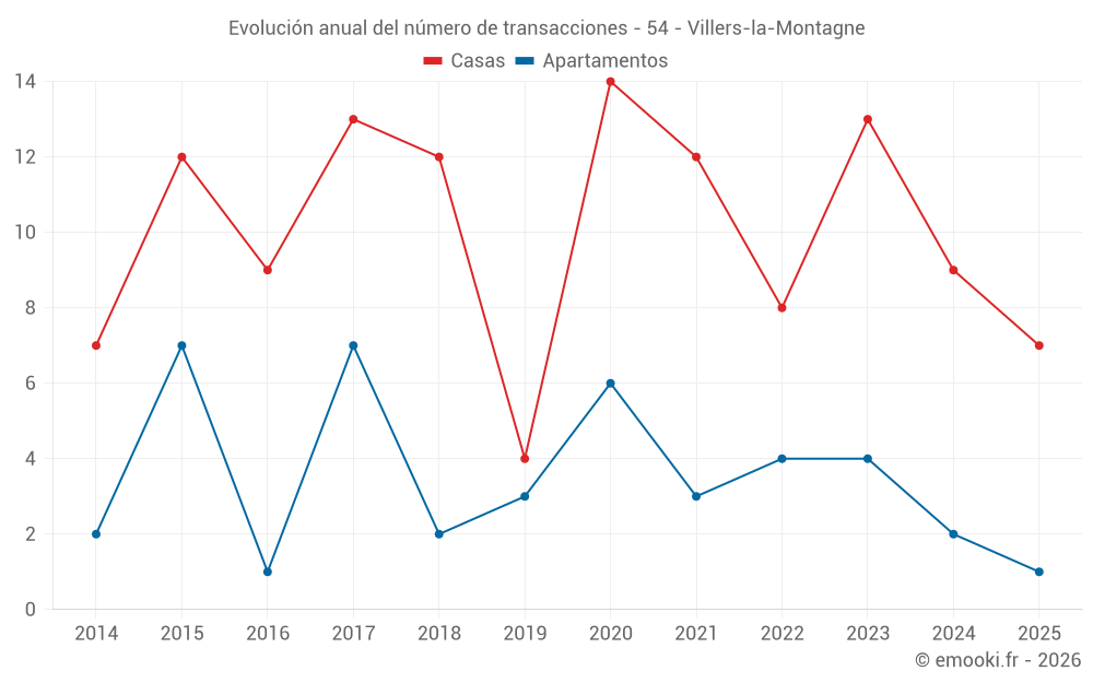El precio mediano en las 24 transacciones de casas de los últimos 24 meses en la comuna de Villers-la-Montagne fue de 2 239 € por metro cuadrado para un valor patrimonial medio de 273 000 €. Durante este período el 60% de las transacciones estuvieron entre 1 576 y 3 199 € por metro cuadrado (del 2º al 8º decil).