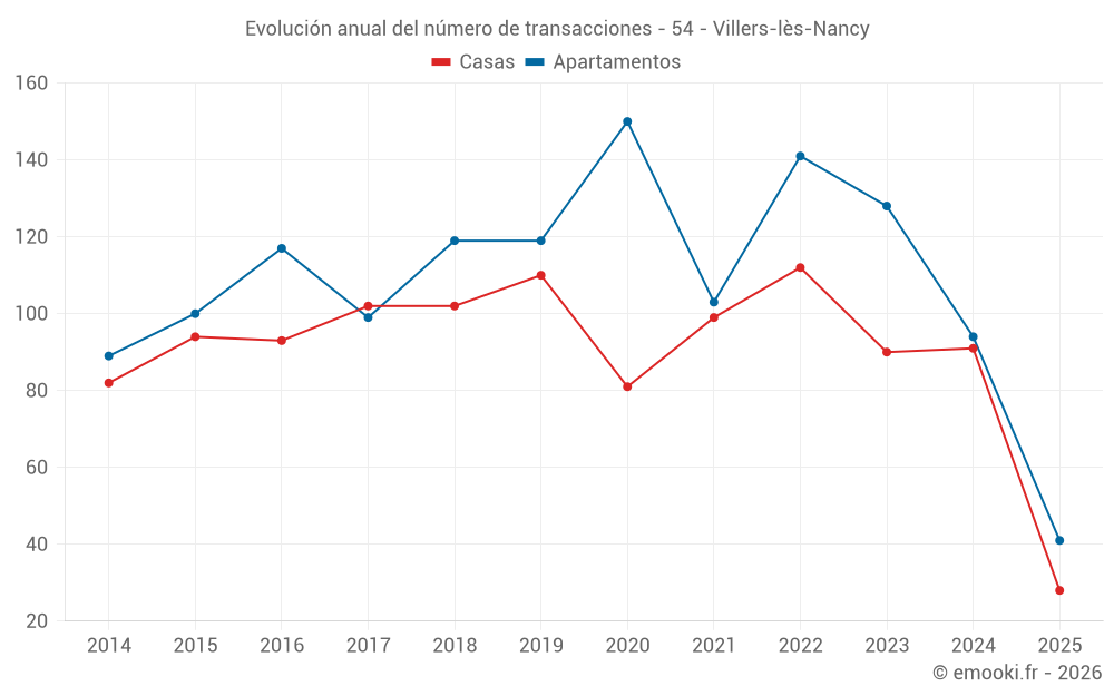 El precio mediano en las 41 transacciones de apartamentos de los últimos 6 meses en la comuna de Villers-lès-Nancy fue de 1 829 € por metro cuadrado para un valor patrimonial medio de 114 000 €. Durante este período el 60% de las transacciones estuvieron entre 1 477 y 2 477 € por metro cuadrado (del 2º al 8º decil).
