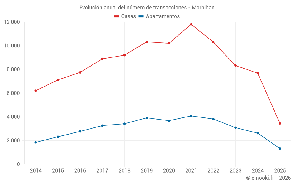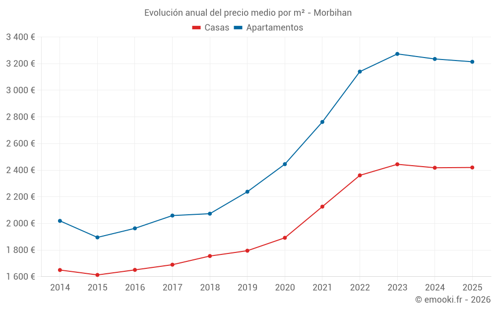 El precio mediano en las 661 transacciones de apartamentos de los últimos 3 meses en el departamento de Morbihan fue de 3 250 € por metro cuadrado para un valor patrimonial medio de 164 500 €. Durante este período el 60% de las transacciones estuvieron entre 2 162 y 4 390 € por metro cuadrado (del 2º al 8º decil).