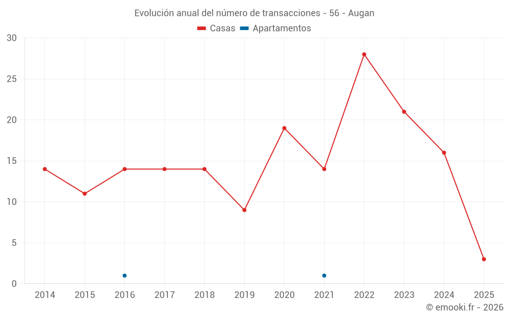 El precio mediano en las 31 transacciones de casas de los últimos 24 meses en la comuna de Augan fue de 1 379 € por metro cuadrado para un valor patrimonial medio de 110 000 €. Durante este período el 60% de las transacciones estuvieron entre 1 001 y 1 818 € por metro cuadrado (del 2º al 8º decil).
