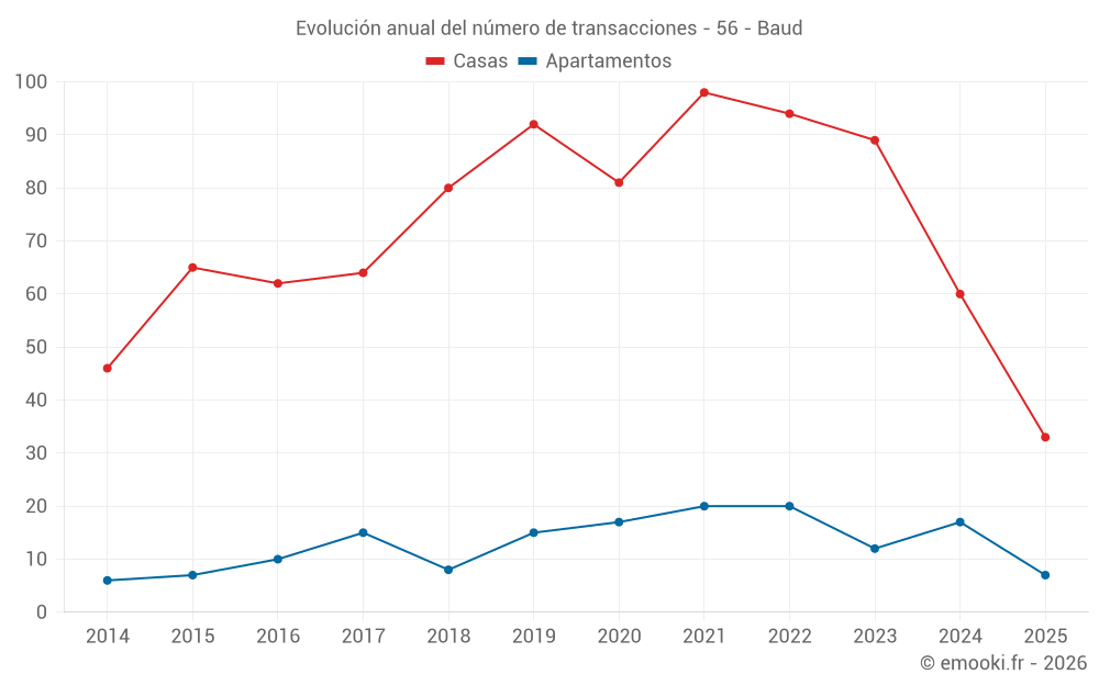 El precio mediano en las 33 transacciones de casas de los últimos 6 meses en la comuna de Baud fue de 2 181 € por metro cuadrado para un valor patrimonial medio de 205 000 €. Durante este período el 60% de las transacciones estuvieron entre 1 715 y 2 568 € por metro cuadrado (del 2º al 8º decil).