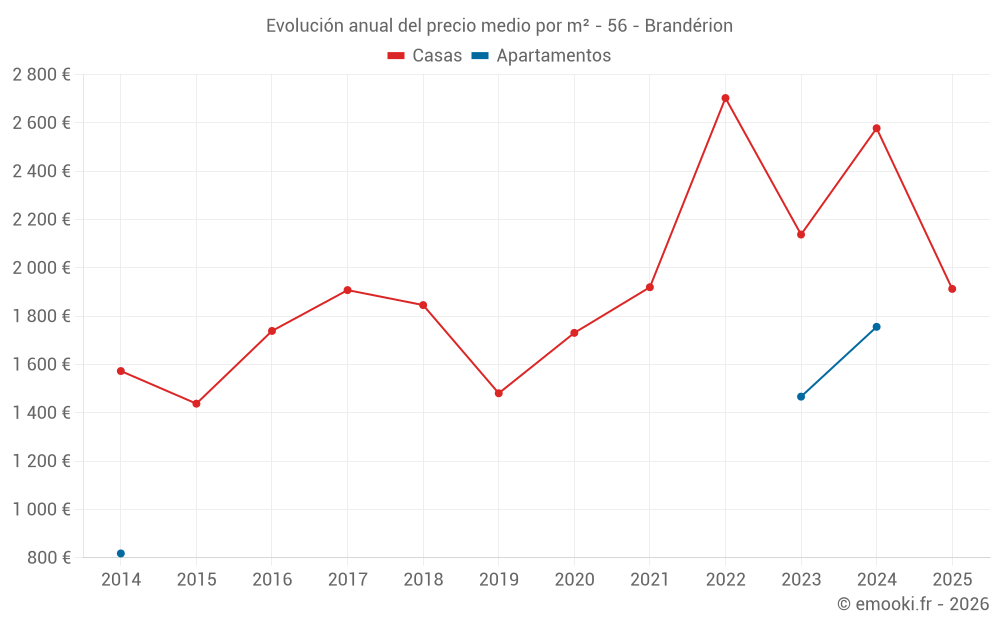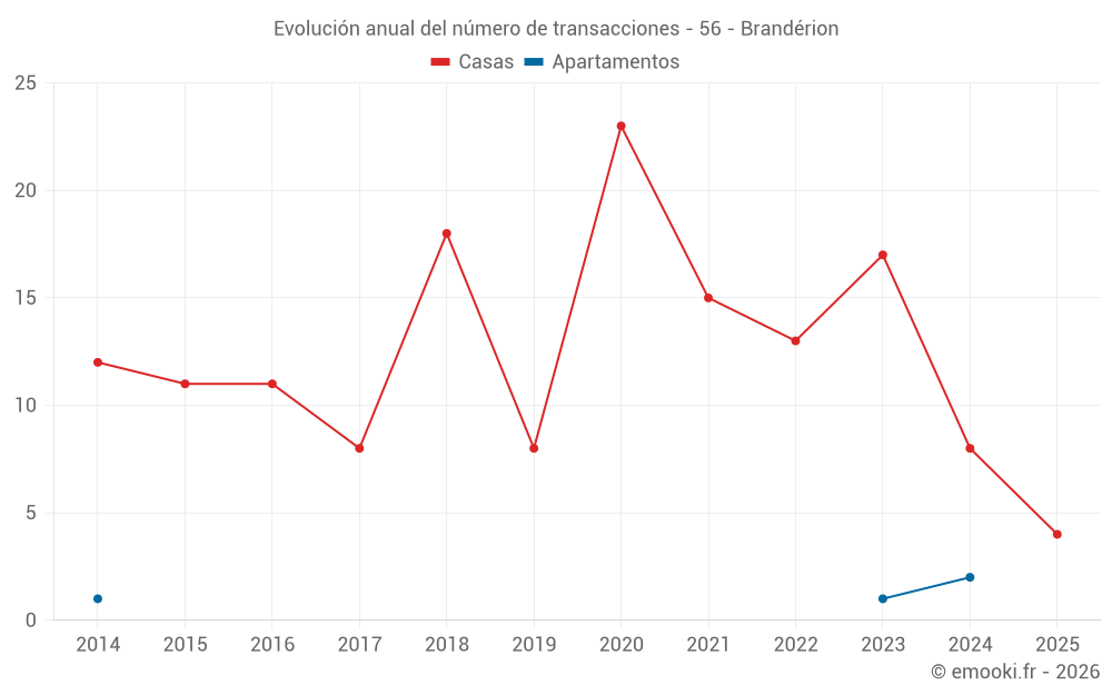 El precio mediano en las 20 transacciones de casas de los últimos 24 meses en la comuna de Brandérion fue de 2 309 € por metro cuadrado para un valor patrimonial medio de 245 000 €. Durante este período el 60% de las transacciones estuvieron entre 1 345 y 2 688 € por metro cuadrado (del 2º al 8º decil).