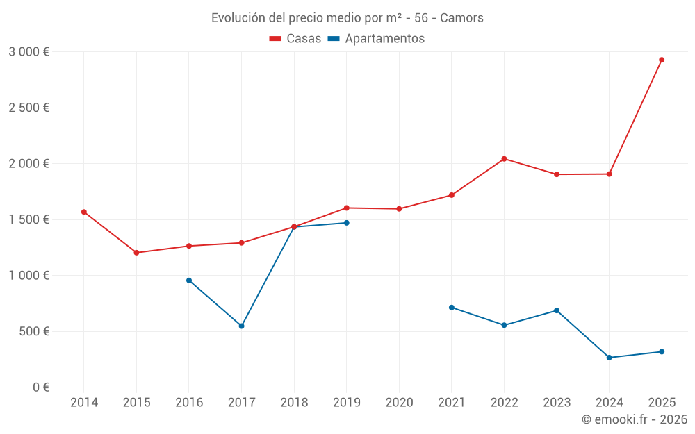 El precio mediano en las 39 transacciones de casas de los últimos 12 meses en la comuna de Camors fue de 2 000 € por metro cuadrado para un valor patrimonial medio de 196 800 €. Durante este período el 60% de las transacciones estuvieron entre 1 619 y 2 957 € por metro cuadrado (del 2º al 8º decil).