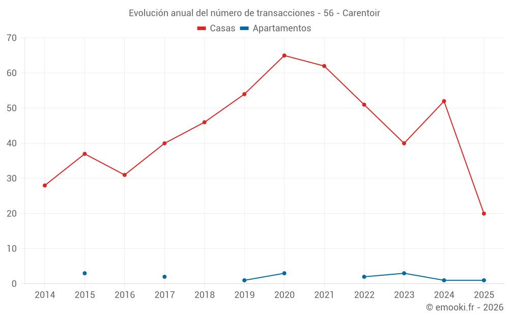 El precio mediano en las 20 transacciones de casas de los últimos 6 meses en la comuna de Carentoir fue de 1 174 € por metro cuadrado para un valor patrimonial medio de 112 000 €. Durante este período el 60% de las transacciones estuvieron entre 746 y 1 838 € por metro cuadrado (del 2º al 8º decil).
