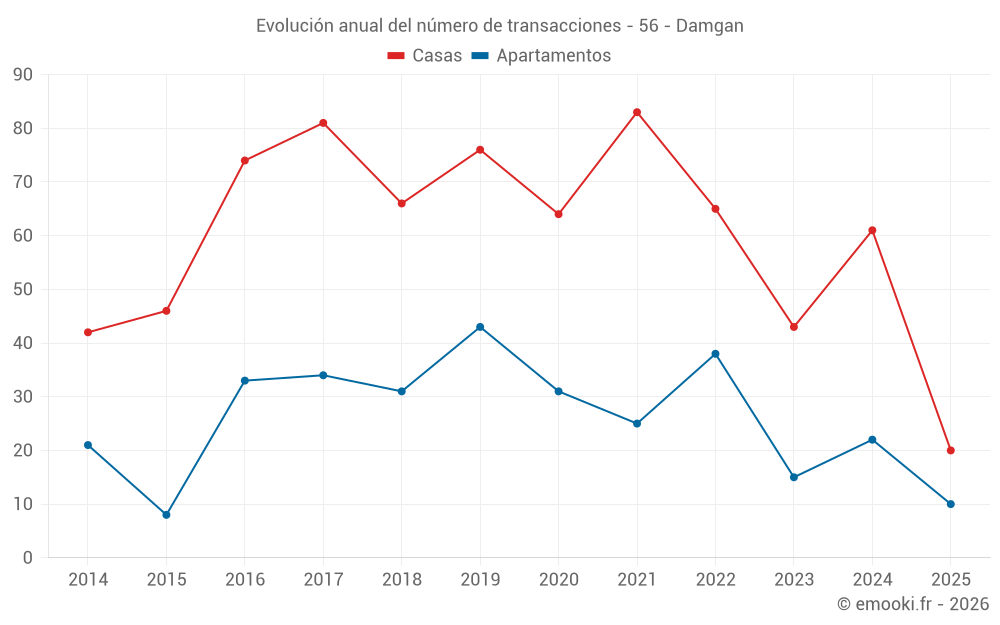 El precio mediano en las 20 transacciones de casas de los últimos 6 meses en la comuna de Damgan fue de 3 774 € por metro cuadrado para un valor patrimonial medio de 360 000 €. Durante este período el 60% de las transacciones estuvieron entre 3 050 y 5 519 € por metro cuadrado (del 2º al 8º decil).