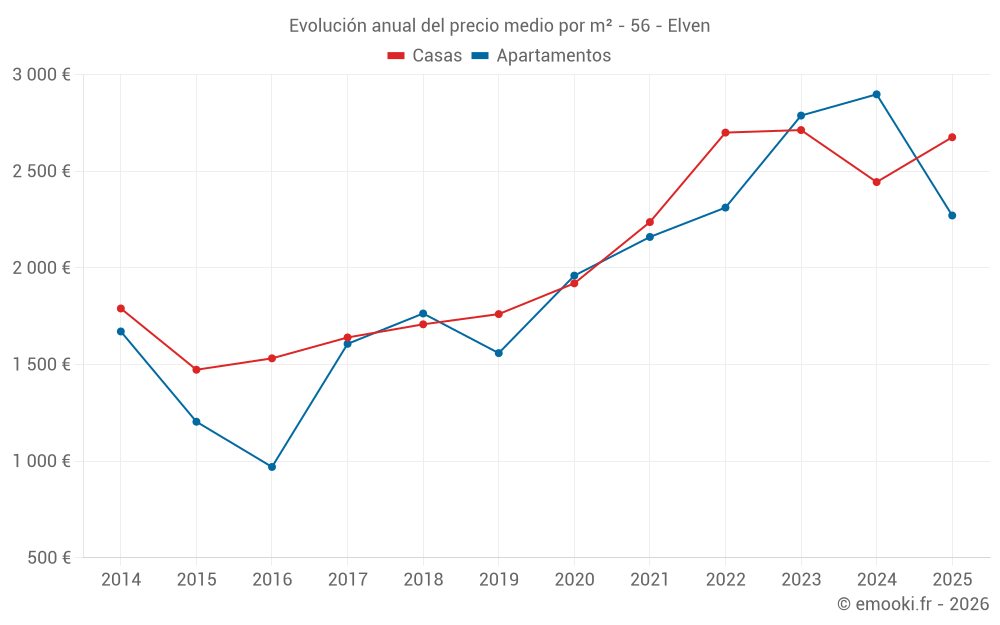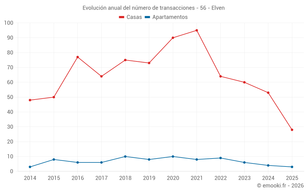 El precio mediano en las 28 transacciones de casas de los últimos 6 meses en la comuna de Elven fue de 2 676 € por metro cuadrado para un valor patrimonial medio de 258 750 €. Durante este período el 60% de las transacciones estuvieron entre 2 295 y 3 036 € por metro cuadrado (del 2º al 8º decil).