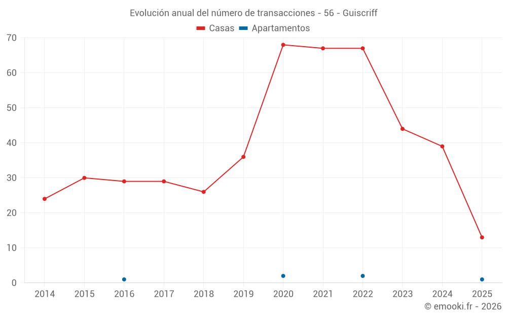 El precio mediano en las 36 transacciones de casas de los últimos 12 meses en la comuna de Guiscriff fue de 1 236 € por metro cuadrado para un valor patrimonial medio de 118 000 €. Durante este período el 60% de las transacciones estuvieron entre 644 y 1 805 € por metro cuadrado (del 2º al 8º decil).