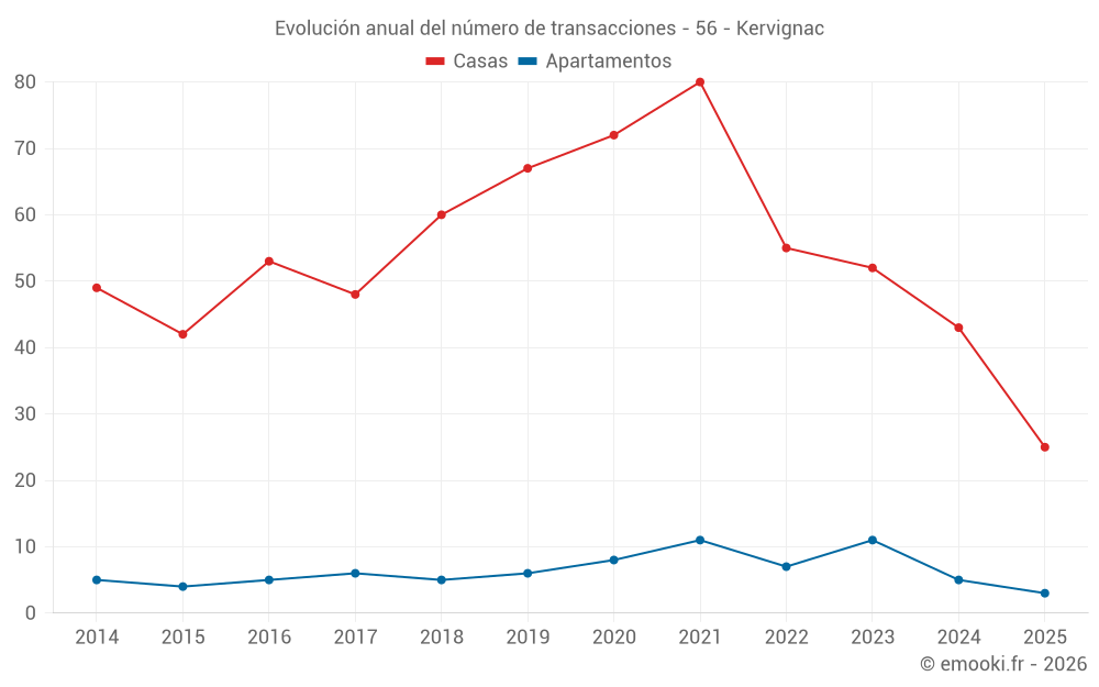 El precio mediano en las 25 transacciones de casas de los últimos 6 meses en la comuna de Kervignac fue de 2 917 € por metro cuadrado para un valor patrimonial medio de 293 900 €. Durante este período el 60% de las transacciones estuvieron entre 2 383 y 3 427 € por metro cuadrado (del 2º al 8º decil).