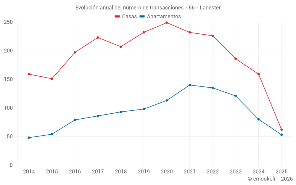 El precio mediano en las 25 transacciones de apartamentos de los últimos 3 meses en la comuna de Lanester fue de 2 568 € por metro cuadrado para un valor patrimonial medio de 160 000 €. Durante este período el 60% de las transacciones estuvieron entre 2 057 y 2 843 € por metro cuadrado (del 2º al 8º decil).