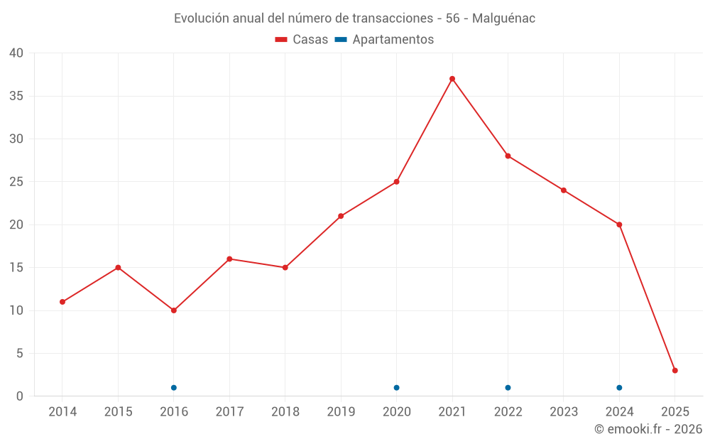 El precio mediano en las 34 transacciones de casas de los últimos 24 meses en la comuna de Malguénac fue de 1 572 € por metro cuadrado para un valor patrimonial medio de 163 000 €. Durante este período el 60% de las transacciones estuvieron entre 1 128 y 2 049 € por metro cuadrado (del 2º al 8º decil).