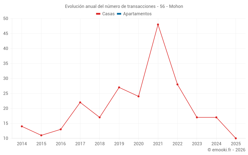 El precio mediano en las 21 transacciones de casas de los últimos 12 meses en la comuna de Mohon fue de 920 € por metro cuadrado para un valor patrimonial medio de 83 000 €. Durante este período el 60% de las transacciones estuvieron entre 625 y 1 339 € por metro cuadrado (del 2º al 8º decil).