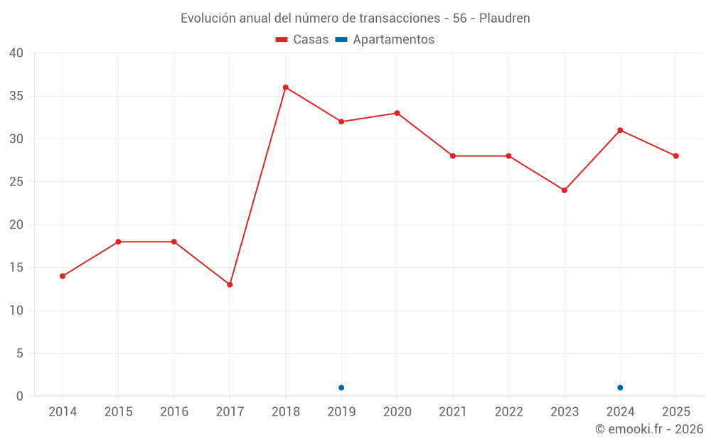 El precio mediano en las 28 transacciones de casas de los últimos 12 meses en la comuna de Plaudren fue de 2 276 € por metro cuadrado para un valor patrimonial medio de 270 900 €. Durante este período el 60% de las transacciones estuvieron entre 1 754 y 3 073 € por metro cuadrado (del 2º al 8º decil).