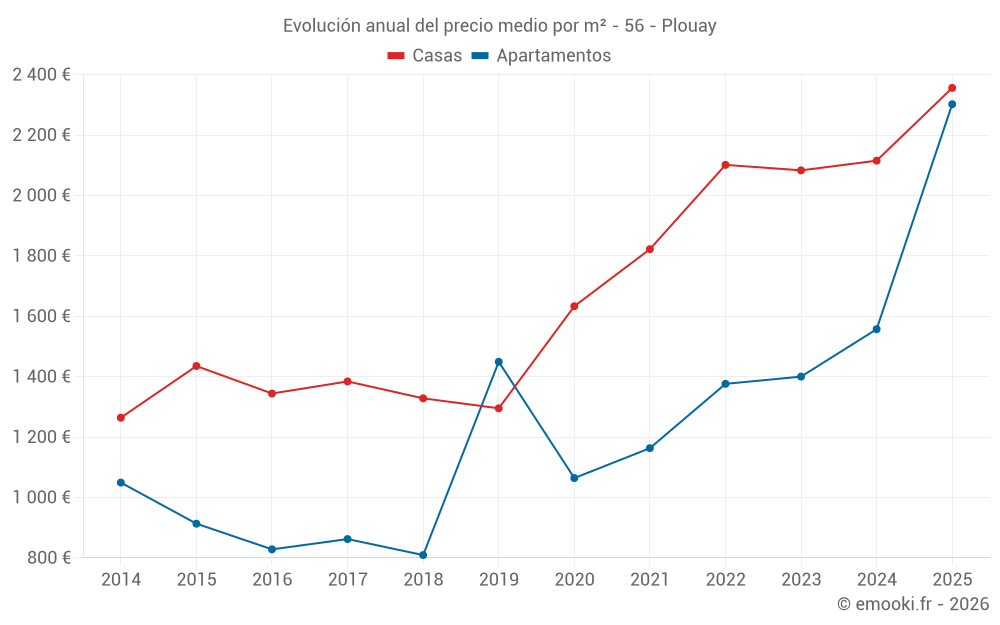 El precio mediano en las 28 transacciones de casas de los últimos 6 meses en la comuna de Plouay fue de 2 356 € por metro cuadrado para un valor patrimonial medio de 225 000 €. Durante este período el 60% de las transacciones estuvieron entre 1 905 y 2 842 € por metro cuadrado (del 2º al 8º decil).