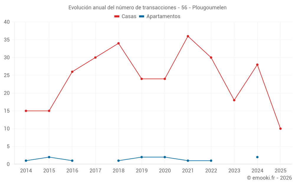 El precio mediano en las 29 transacciones de casas de los últimos 12 meses en la comuna de Plougoumelen fue de 3 523 € por metro cuadrado para un valor patrimonial medio de 375 000 €. Durante este período el 60% de las transacciones estuvieron entre 2 763 y 4 406 € por metro cuadrado (del 2º al 8º decil).
