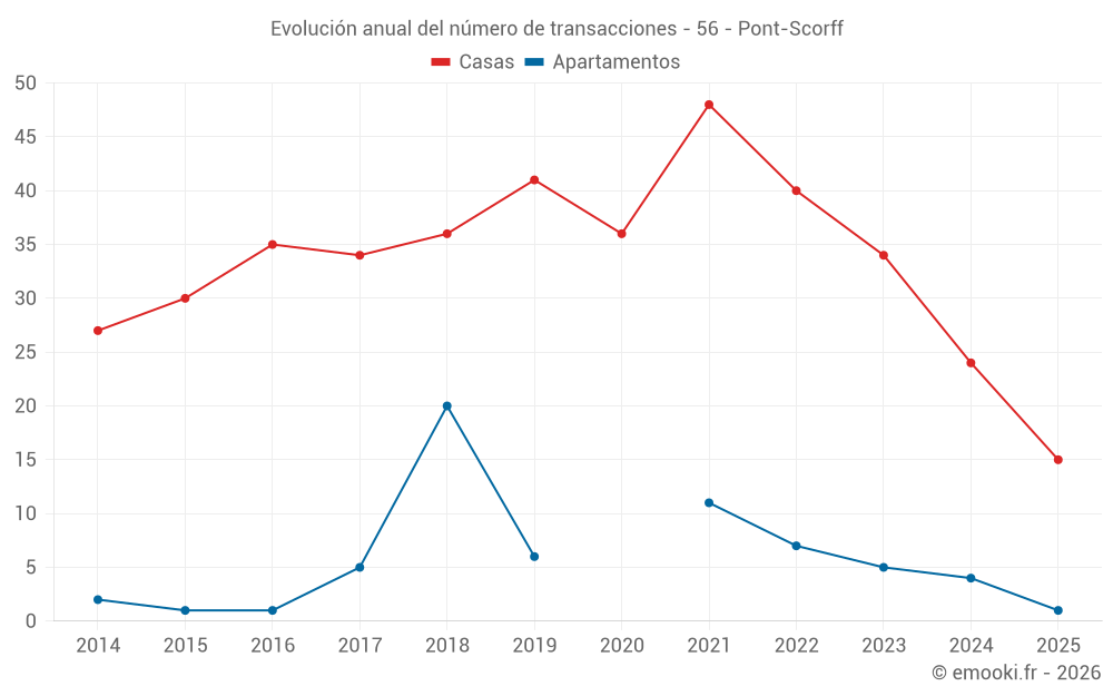 El precio mediano en las 28 transacciones de casas de los últimos 12 meses en la comuna de Pont-Scorff fue de 2 762 € por metro cuadrado para un valor patrimonial medio de 275 000 €. Durante este período el 60% de las transacciones estuvieron entre 1 933 y 3 109 € por metro cuadrado (del 2º al 8º decil).