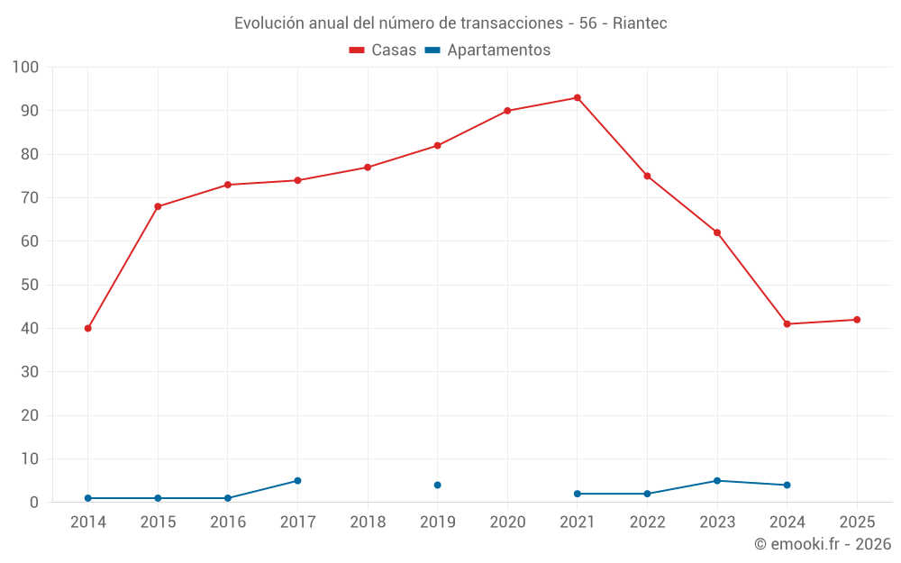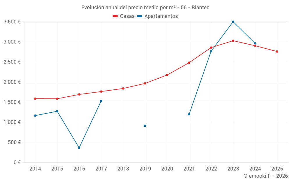 El precio mediano en las 42 transacciones de casas de los últimos 6 meses en la comuna de Riantec fue de 2 759 € por metro cuadrado para un valor patrimonial medio de 246 750 €. Durante este período el 60% de las transacciones estuvieron entre 2 134 y 3 406 € por metro cuadrado (del 2º al 8º decil).