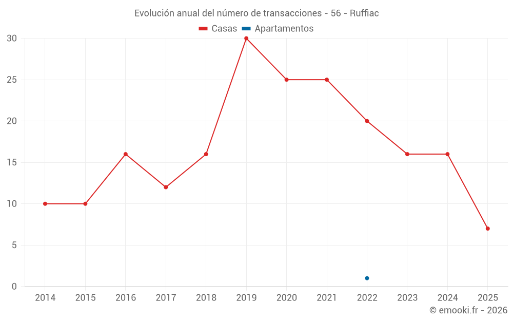 El precio mediano en las 31 transacciones de casas de los últimos 24 meses en la comuna de Ruffiac fue de 1 525 € por metro cuadrado para un valor patrimonial medio de 127 000 €. Durante este período el 60% de las transacciones estuvieron entre 963 y 1 875 € por metro cuadrado (del 2º al 8º decil).