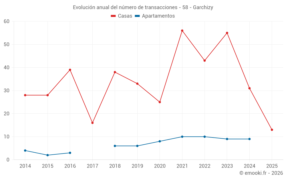 El precio mediano en las 33 transacciones de casas de los últimos 12 meses en la comuna de Garchizy fue de 1 164 € por metro cuadrado para un valor patrimonial medio de 90 000 €. Durante este período el 60% de las transacciones estuvieron entre 919 y 1 654 € por metro cuadrado (del 2º al 8º decil).