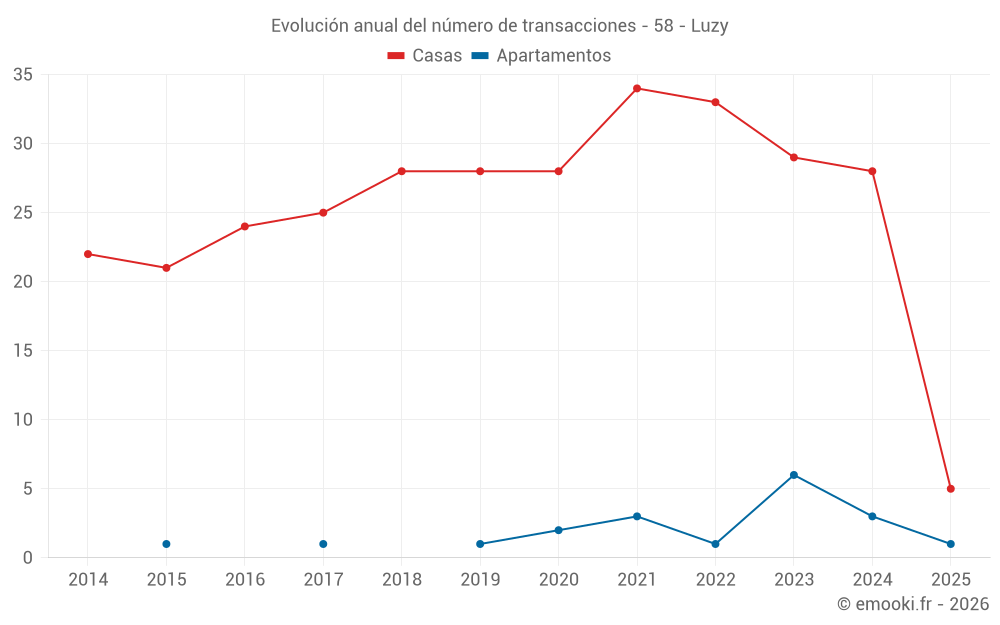El precio mediano en las 20 transacciones de casas de los últimos 12 meses en la comuna de Luzy fue de 1 168 € por metro cuadrado para un valor patrimonial medio de 102 500 €. Durante este período el 60% de las transacciones estuvieron entre 714 y 1 608 € por metro cuadrado (del 2º al 8º decil).