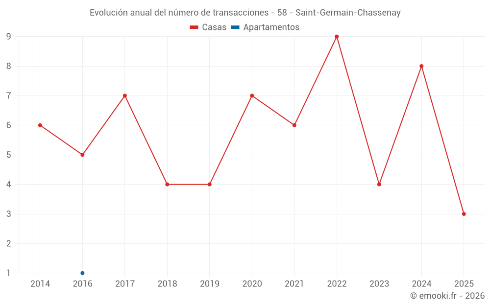 El precio mediano en las 14 transacciones de casas de los últimos 24 meses en la comuna de Saint-Germain-Chassenay fue de 850 € por metro cuadrado para un valor patrimonial medio de 72 500 €. Durante este período el 60% de las transacciones estuvieron entre 533 y 1 358 € por metro cuadrado (del 2º al 8º decil).