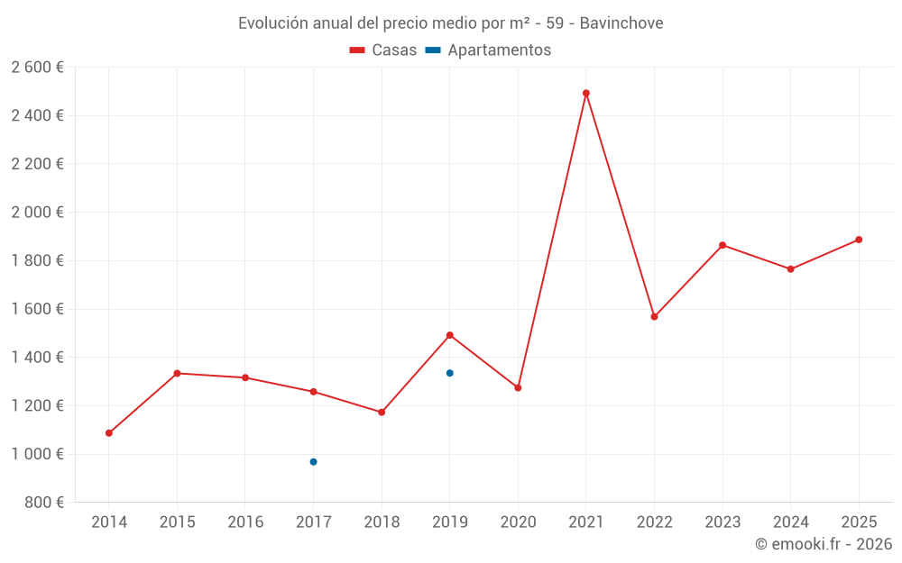 El precio mediano en las 29 transacciones de casas de los últimos 24 meses en la comuna de Bavinchove fue de 1 765 € por metro cuadrado para un valor patrimonial medio de 170 000 €. Durante este período el 60% de las transacciones estuvieron entre 1 393 y 2 298 € por metro cuadrado (del 2º al 8º decil).