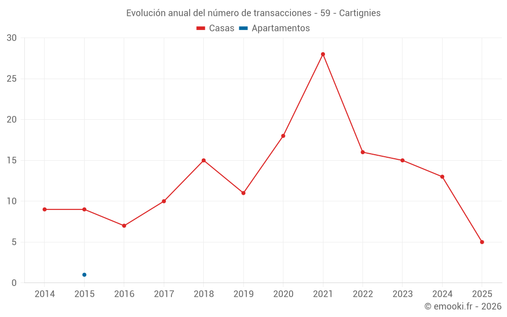 El precio mediano en las 26 transacciones de casas de los últimos 24 meses en la comuna de Cartignies fue de 1 462 € por metro cuadrado para un valor patrimonial medio de 154 000 €. Durante este período el 60% de las transacciones estuvieron entre 1 168 y 1 831 € por metro cuadrado (del 2º al 8º decil).