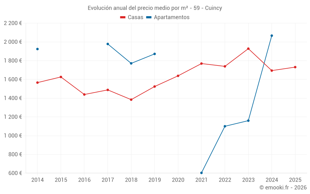 El precio mediano en las 26 transacciones de casas de los últimos 6 meses en la comuna de Cuincy fue de 1 731 € por metro cuadrado para un valor patrimonial medio de 152 000 €. Durante este período el 60% de las transacciones estuvieron entre 1 287 y 1 882 € por metro cuadrado (del 2º al 8º decil).