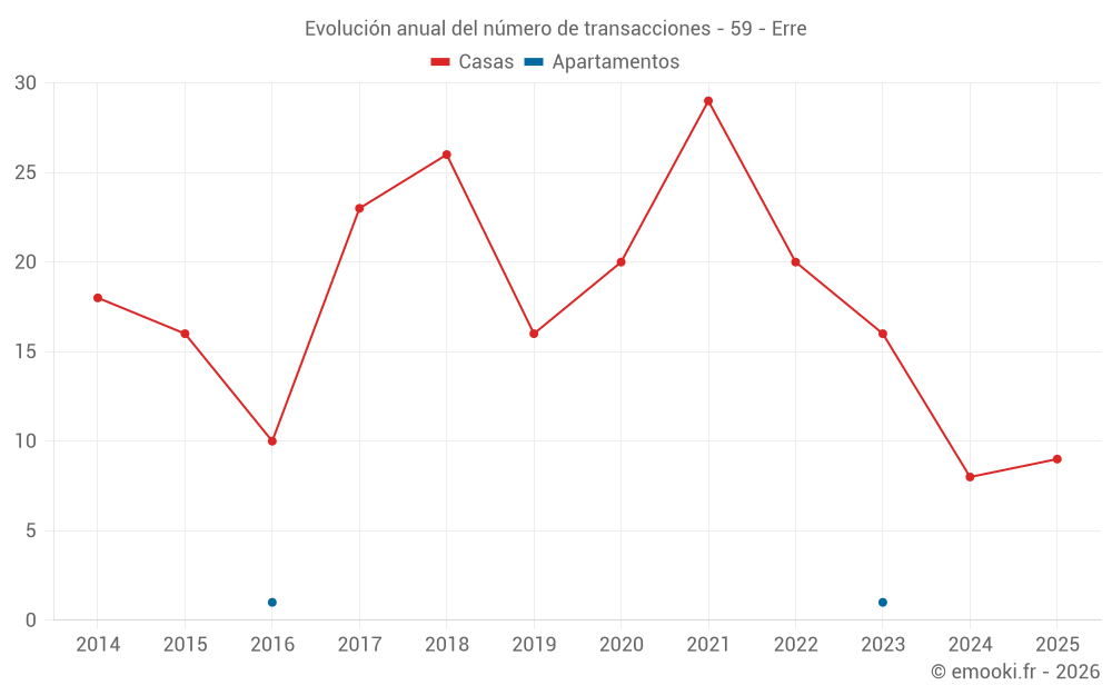 El precio mediano en las 26 transacciones de casas de los últimos 24 meses en la comuna de Erre fue de 1 709 € por metro cuadrado para un valor patrimonial medio de 181 000 €. Durante este período el 60% de las transacciones estuvieron entre 1 314 y 2 119 € por metro cuadrado (del 2º al 8º decil).