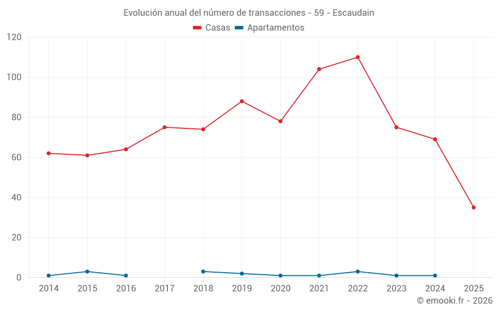 El precio mediano en las 35 transacciones de casas de los últimos 6 meses en la comuna de Escaudain fue de 1 294 € por metro cuadrado para un valor patrimonial medio de 126 000 €. Durante este período el 60% de las transacciones estuvieron entre 798 y 1 728 € por metro cuadrado (del 2º al 8º decil).