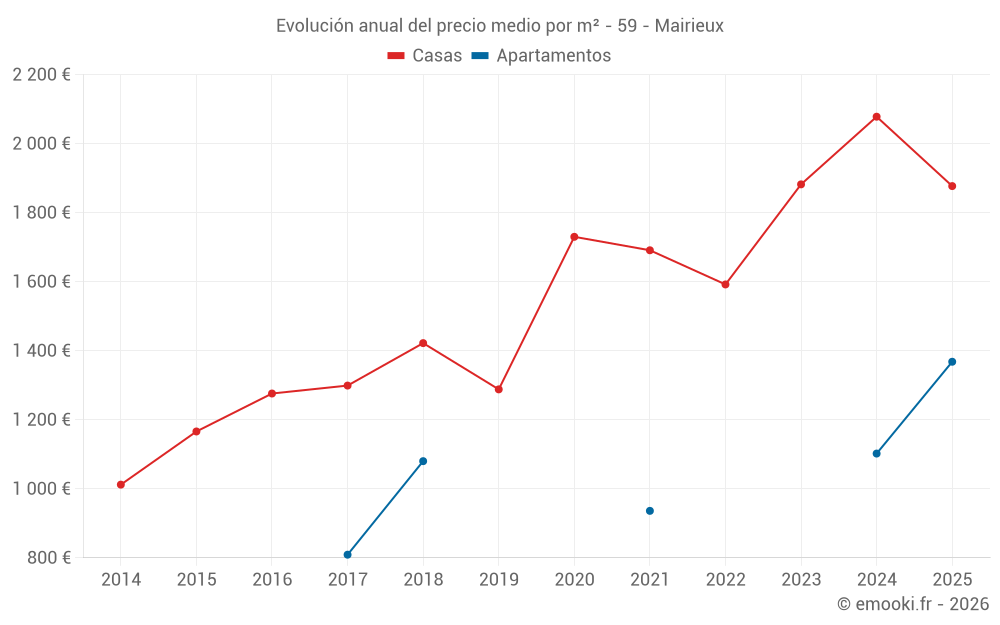 El precio mediano en las 15 transacciones de casas de los últimos 24 meses en la comuna de Mairieux fue de 1 882 € por metro cuadrado para un valor patrimonial medio de 206 000 €. Durante este período el 60% de las transacciones estuvieron entre 1 610 y 2 330 € por metro cuadrado (del 2º al 8º decil).