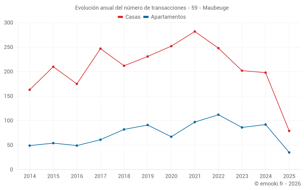 El precio mediano en las 35 transacciones de apartamentos de los últimos 6 meses en la comuna de Maubeuge fue de 909 € por metro cuadrado para un valor patrimonial medio de 59 000 €. Durante este período el 60% de las transacciones estuvieron entre 647 y 1 202 € por metro cuadrado (del 2º al 8º decil).