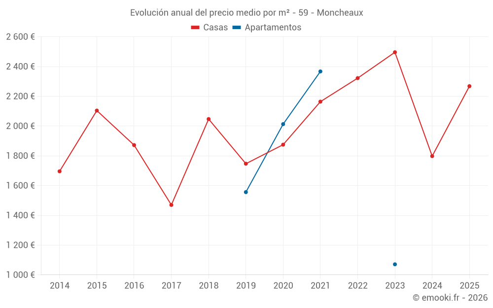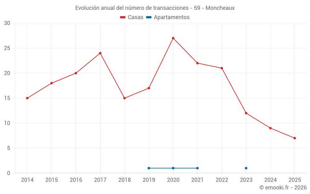 El precio mediano en las 23 transacciones de casas de los últimos 24 meses en la comuna de Moncheaux fue de 2 182 € por metro cuadrado para un valor patrimonial medio de 232 000 €. Durante este período el 60% de las transacciones estuvieron entre 1 706 y 2 905 € por metro cuadrado (del 2º al 8º decil).