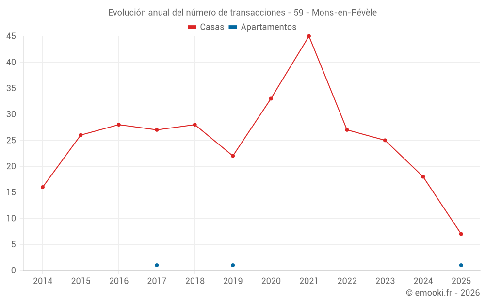 El precio mediano en las 17 transacciones de casas de los últimos 12 meses en la comuna de Mons-en-Pévèle fue de 2 018 € por metro cuadrado para un valor patrimonial medio de 200 000 €. Durante este período el 60% de las transacciones estuvieron entre 1 554 y 3 032 € por metro cuadrado (del 2º al 8º decil).