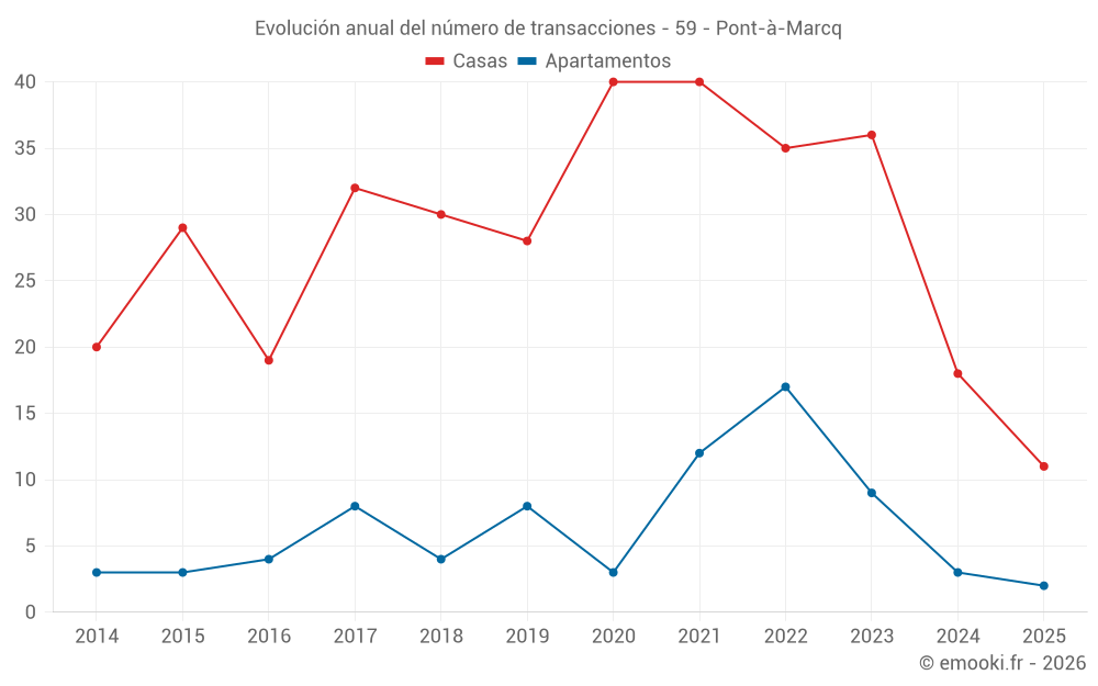 El precio mediano en las 24 transacciones de casas de los últimos 12 meses en la comuna de Pont-à-Marcq fue de 2 940 € por metro cuadrado para un valor patrimonial medio de 245 000 €. Durante este período el 60% de las transacciones estuvieron entre 2 094 y 3 472 € por metro cuadrado (del 2º al 8º decil).