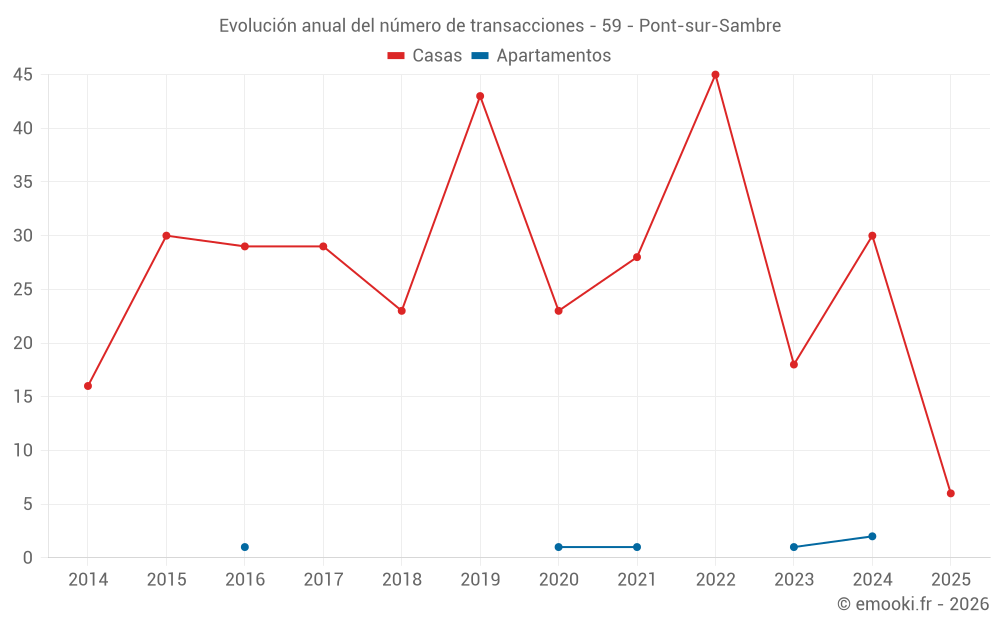 El precio mediano en las 26 transacciones de casas de los últimos 12 meses en la comuna de Pont-sur-Sambre fue de 1 190 € por metro cuadrado para un valor patrimonial medio de 111 500 €. Durante este período el 60% de las transacciones estuvieron entre 843 y 1 567 € por metro cuadrado (del 2º al 8º decil).