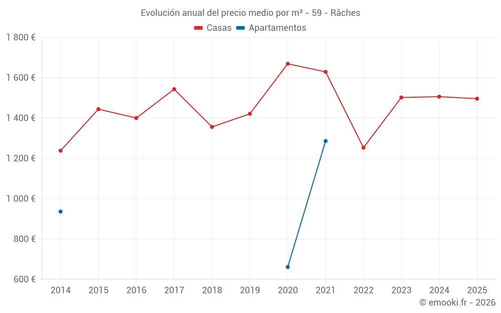 El precio mediano en las 30 transacciones de casas de los últimos 12 meses en la comuna de Râches fue de 1 366 € por metro cuadrado para un valor patrimonial medio de 139 500 €. Durante este período el 60% de las transacciones estuvieron entre 926 y 1 830 € por metro cuadrado (del 2º al 8º decil).