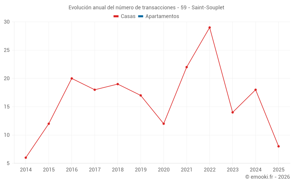 El precio mediano en las 17 transacciones de casas de los últimos 12 meses en la comuna de Saint-Souplet fue de 981 € por metro cuadrado para un valor patrimonial medio de 80 000 €. Durante este período el 60% de las transacciones estuvieron entre 615 y 1 423 € por metro cuadrado (del 2º al 8º decil).