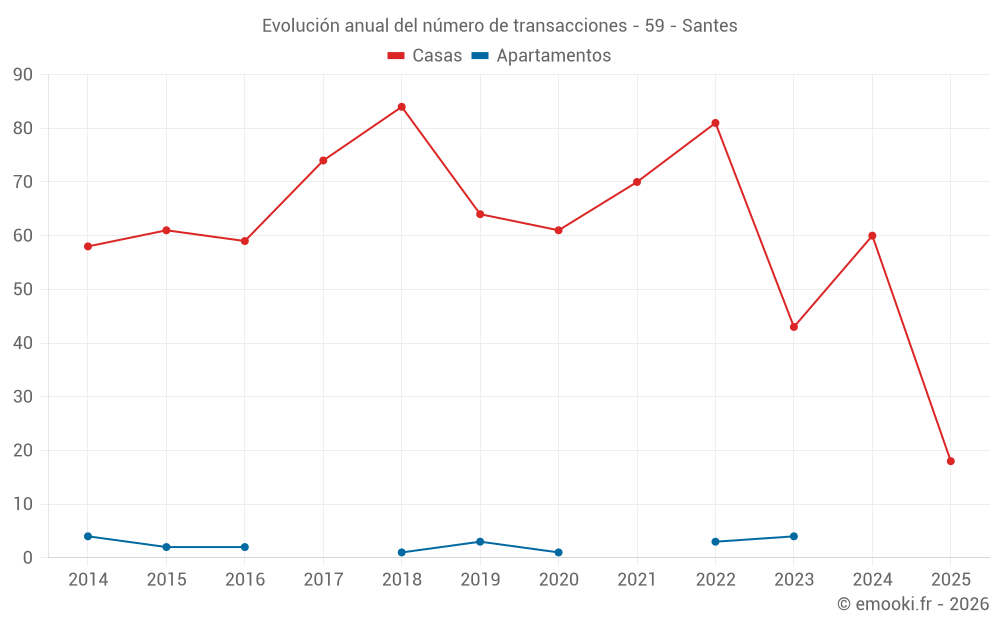 El precio mediano en las 18 transacciones de casas de los últimos 6 meses en la comuna de Santes fue de 2 428 € por metro cuadrado para un valor patrimonial medio de 265 950 €. Durante este período el 60% de las transacciones estuvieron entre 2 123 y 3 030 € por metro cuadrado (del 2º al 8º decil).