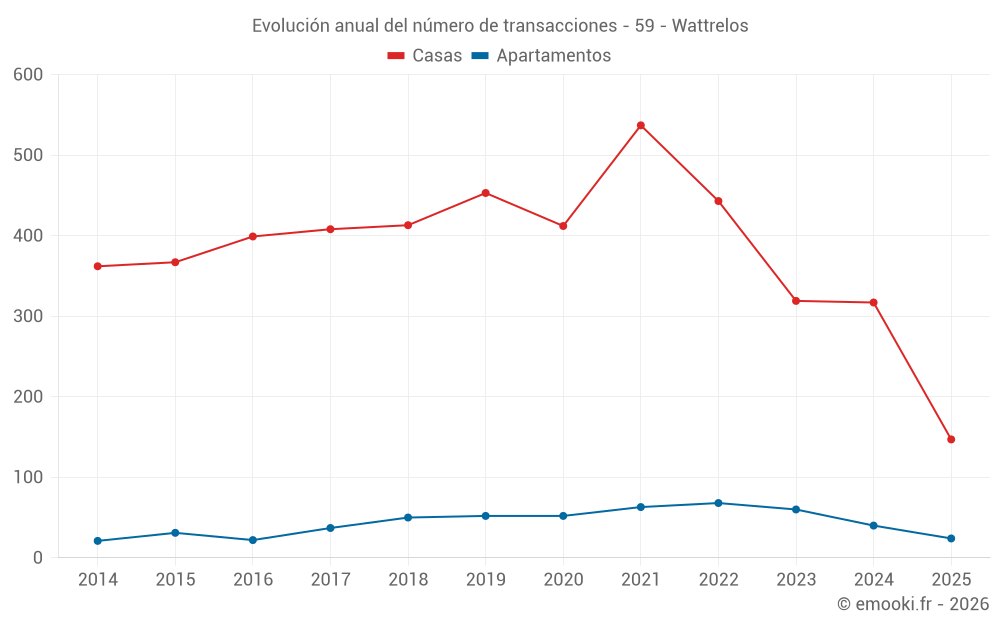 El precio mediano en las 24 transacciones de apartamentos de los últimos 6 meses en la comuna de Wattrelos fue de 1 992 € por metro cuadrado para un valor patrimonial medio de 124 000 €. Durante este período el 60% de las transacciones estuvieron entre 1 568 y 2 285 € por metro cuadrado (del 2º al 8º decil).