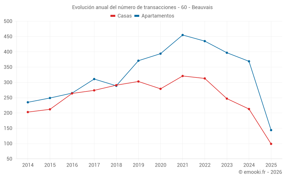 El precio mediano en las 69 transacciones de apartamentos de los últimos 3 meses en la comuna de Beauvais fue de 1 563 € por metro cuadrado para un valor patrimonial medio de 90 000 €. Durante este período el 60% de las transacciones estuvieron entre 1 119 y 2 237 € por metro cuadrado (del 2º al 8º decil).