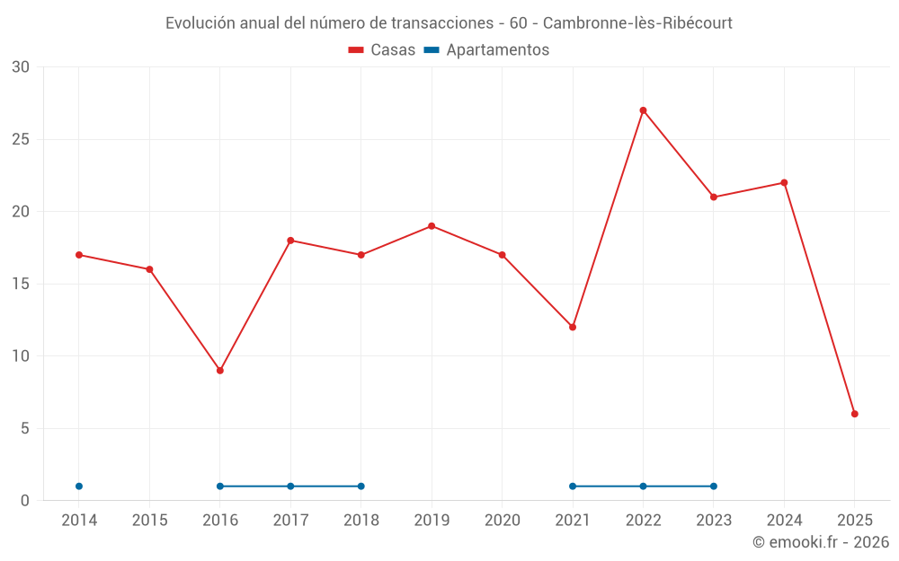 El precio mediano en las 18 transacciones de casas de los últimos 12 meses en la comuna de Cambronne-lès-Ribécourt fue de 1 844 € por metro cuadrado para un valor patrimonial medio de 176 000 €. Durante este período el 60% de las transacciones estuvieron entre 1 412 y 2 373 € por metro cuadrado (del 2º al 8º decil).