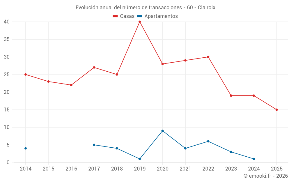 El precio mediano en las 25 transacciones de casas de los últimos 12 meses en la comuna de Clairoix fue de 2 357 € por metro cuadrado para un valor patrimonial medio de 199 000 €. Durante este período el 60% de las transacciones estuvieron entre 1 776 y 2 919 € por metro cuadrado (del 2º al 8º decil).