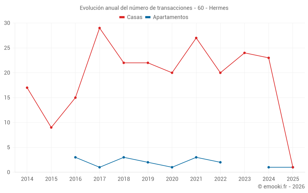 El precio mediano en las 40 transacciones de casas de los últimos 24 meses en la comuna de Hermes fue de 2 125 € por metro cuadrado para un valor patrimonial medio de 192 500 €. Durante este período el 60% de las transacciones estuvieron entre 1 831 y 2 668 € por metro cuadrado (del 2º al 8º decil).