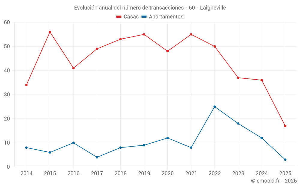 El precio mediano en las 22 transacciones de apartamentos de los últimos 24 meses en la comuna de Laigneville fue de 1 848 € por metro cuadrado para un valor patrimonial medio de 114 500 €. Durante este período el 60% de las transacciones estuvieron entre 1 454 y 2 113 € por metro cuadrado (del 2º al 8º decil).