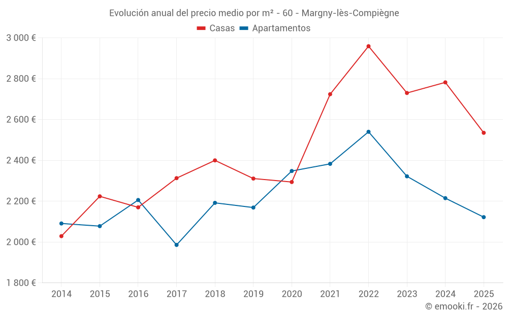 El precio mediano en las 33 transacciones de casas de los últimos 6 meses en la comuna de Margny-lès-Compiègne fue de 2 535 € por metro cuadrado para un valor patrimonial medio de 215 000 €. Durante este período el 60% de las transacciones estuvieron entre 1 840 y 2 914 € por metro cuadrado (del 2º al 8º decil).